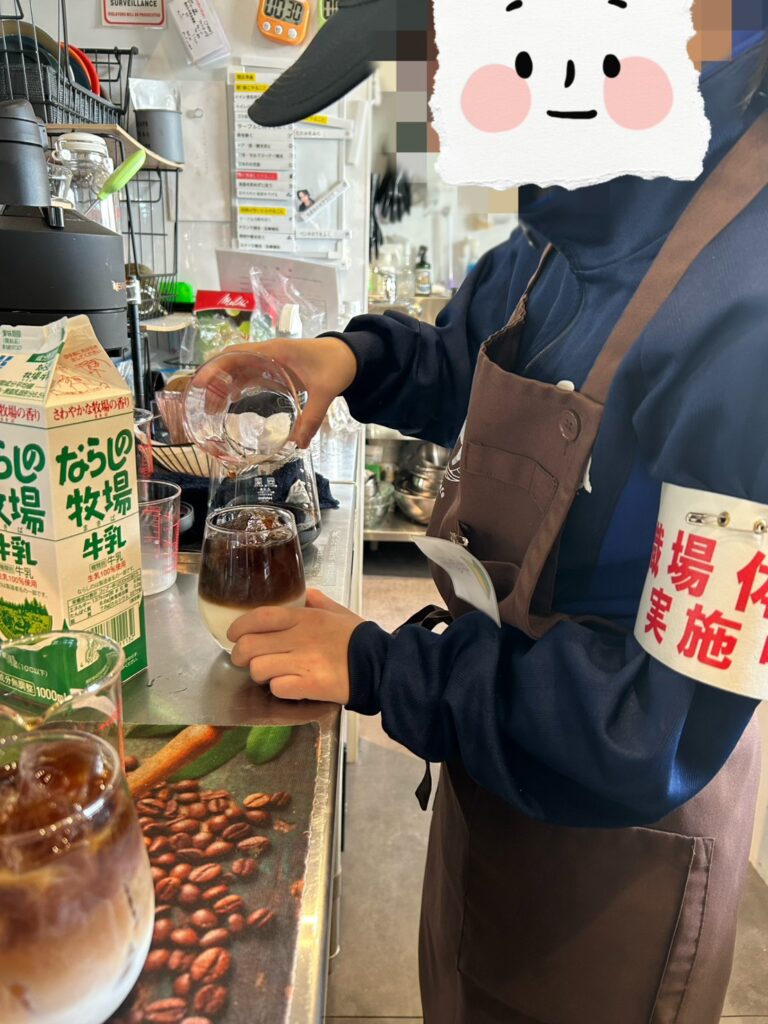 草加市の中学一年生・Sさんが職場体験に来てくれました。2日間の体験期間中、小学生とは思えないほどしっかりとした姿勢で、積極的に動き、気づいたことをメモする姿が印象的でした。 最終日には自分でカフェオレ作りに挑戦し、見事な2層のカフェオレを完成させました。2日間お疲れさまでした!またいつでもプライベートで遊びに来てくださいね。