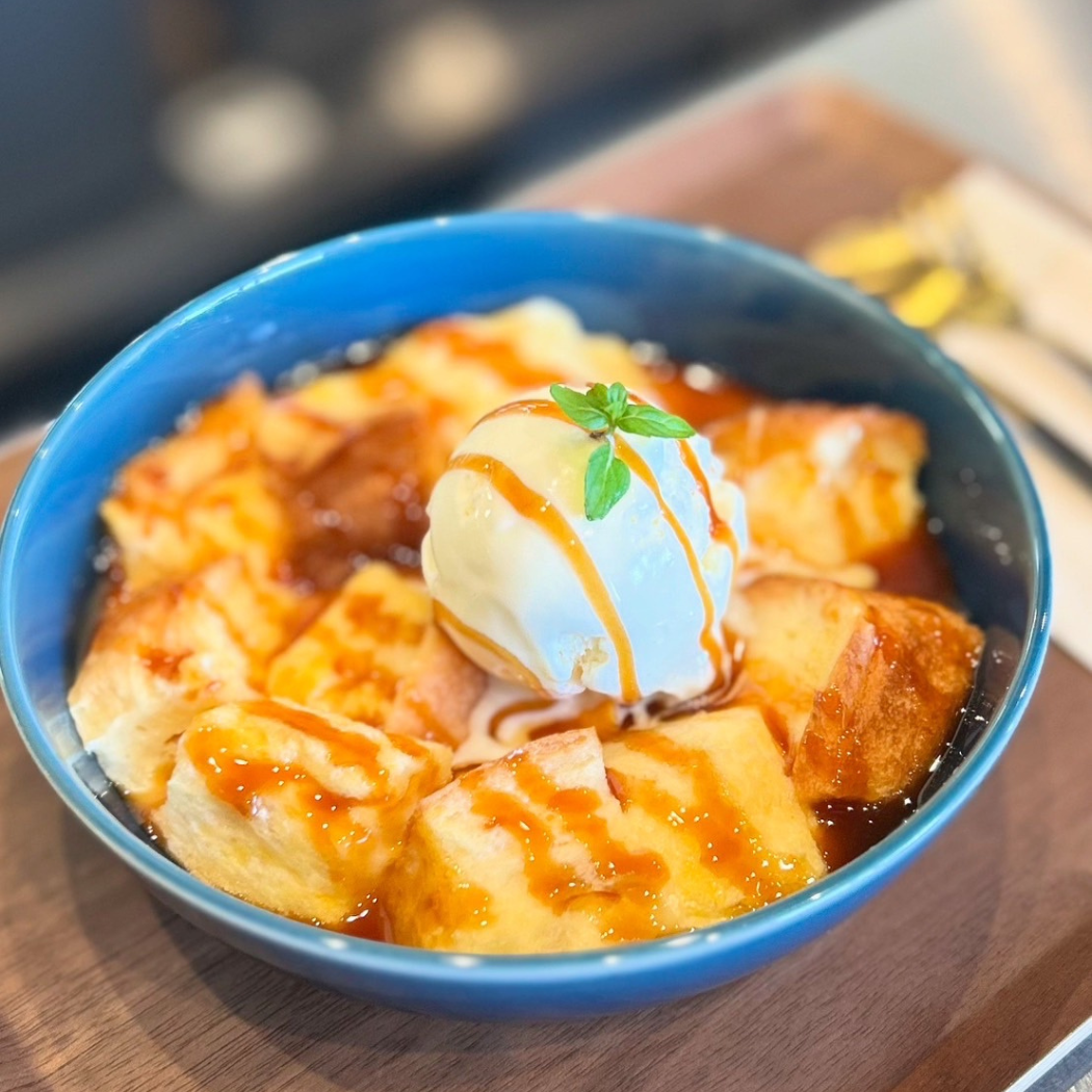 熱々のパンプディングにバニラアイスを添え、ソースは 🍫チョコ・🍯キャラメル・🍃アガベシロップ からお選びいただけます